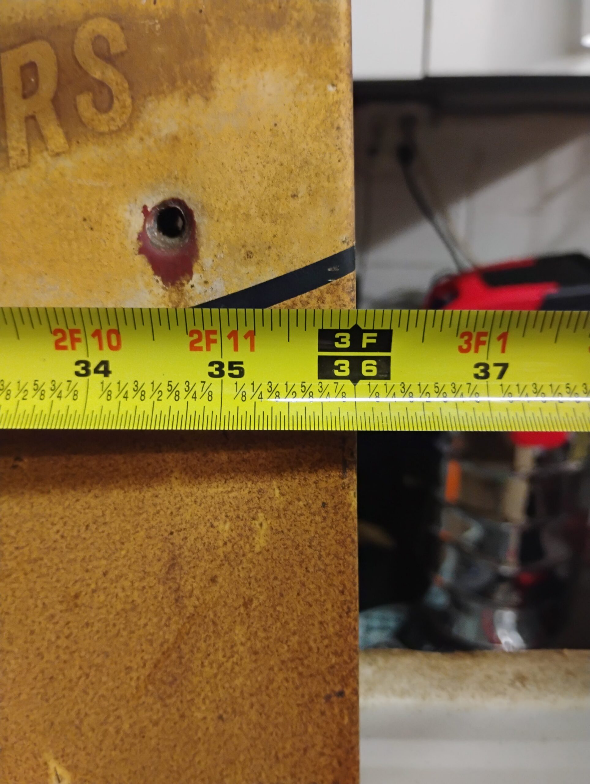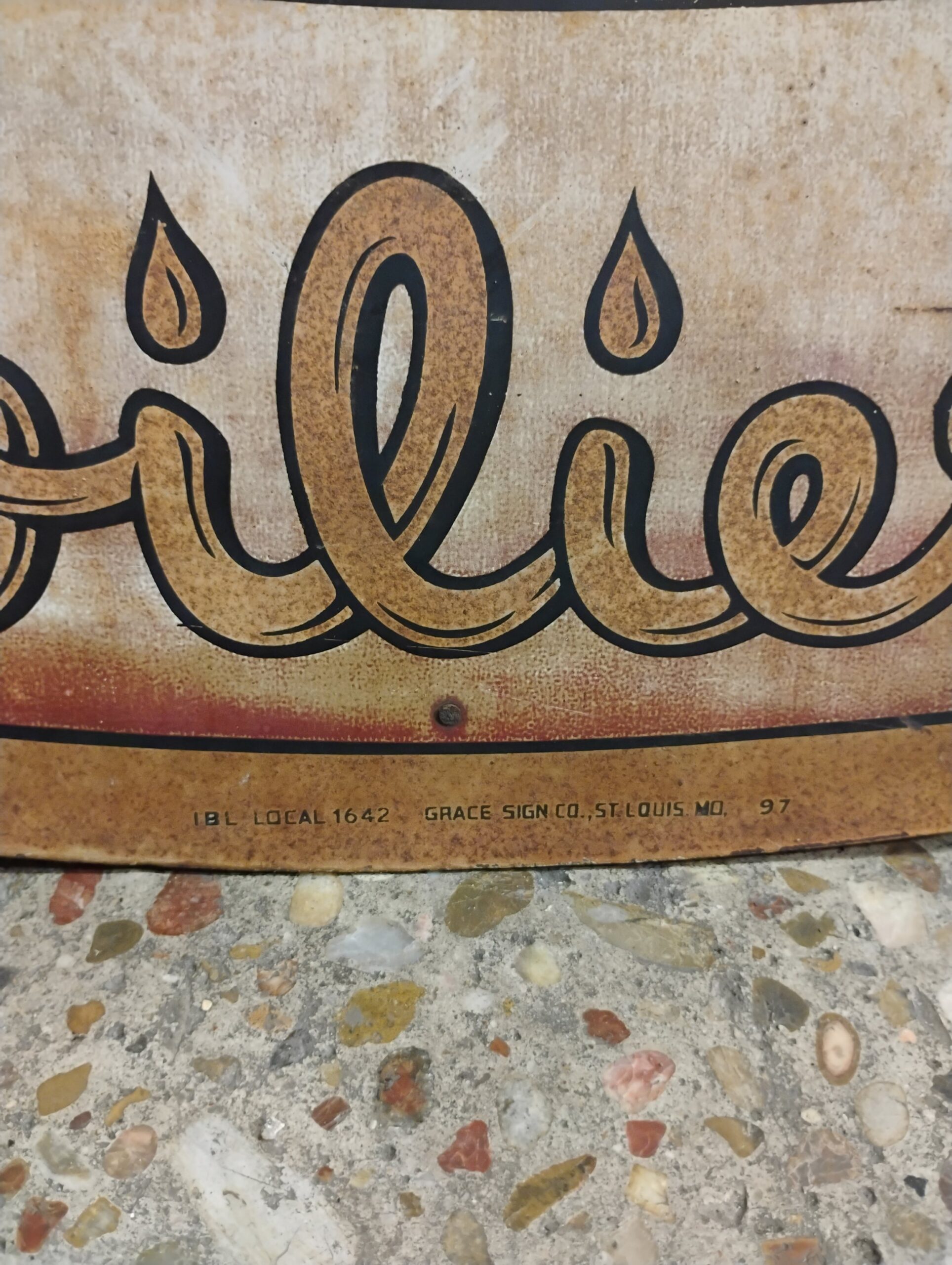 Amalie Can Sign, Circa 1997, Patina, Approximately 5ft. X 3ft. Please inspect all photos carefully for condition, all items are sold as is.