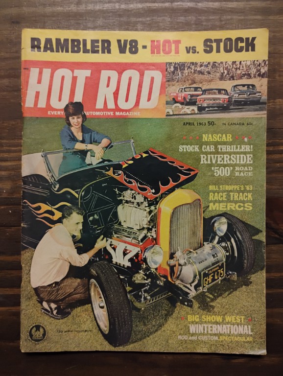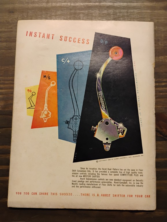 April 1963 Hot Rod Magazine, Features Rambler V8 – Hot vs. Stock, Advertising Hurst Shifter ad on the back.