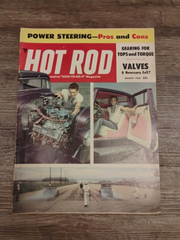 August 1956 Hot Rod Magazine, Power Steering-Pros and Cons, Advertising Grant Piston Rings on the back. Please inspect all photos carefully for condition, all items are sold as is.
