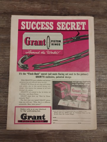August 1956 Hot Rod Magazine, Power Steering-Pros and Cons, Advertising Grant Piston Rings on the back.