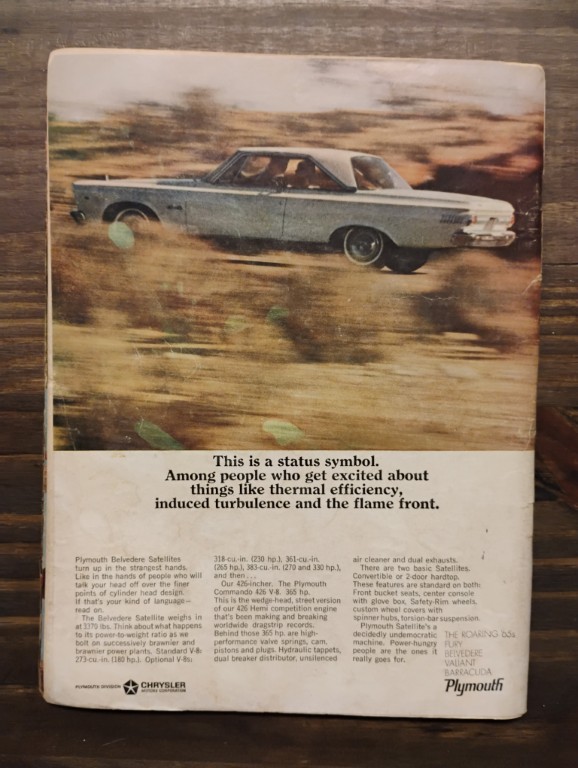 August 1965 Hot Rod Magazine, Features How Ford Broke the Offy Grip, Advertising a Plymouth Barracuda Car ad on the back.