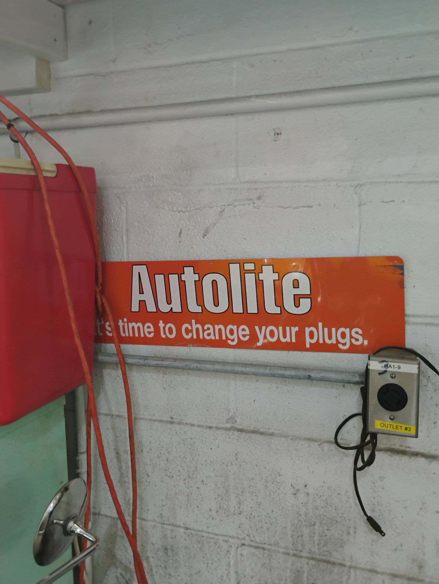 Autolite Sign, Red and White, Approximately in. x in. Please inspect all photos carefully for condition, all items are sold as is.