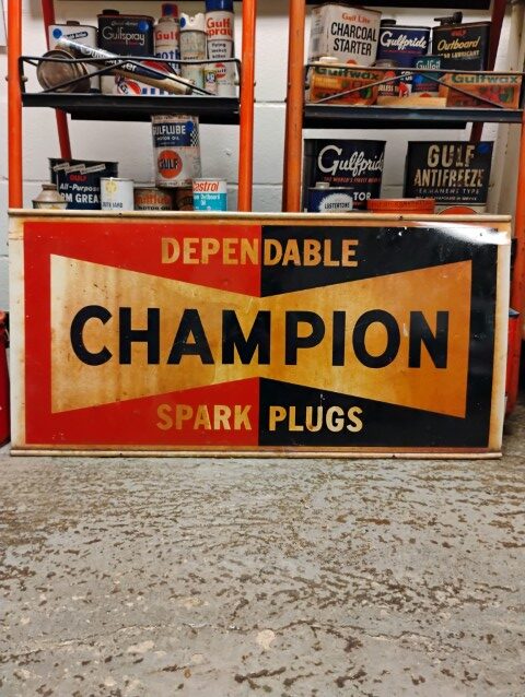 Champion Spark Plug Sign, Double-Sided, Approximately 18in. x 3ft. Please inspect the photos carefully for condition, all items are sold as is.