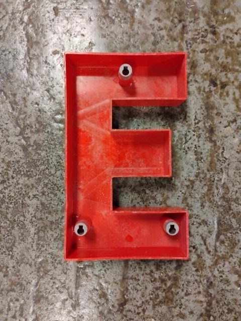 “E” Sign, Red, Plastic, Approximately 16in. in Diameter.
