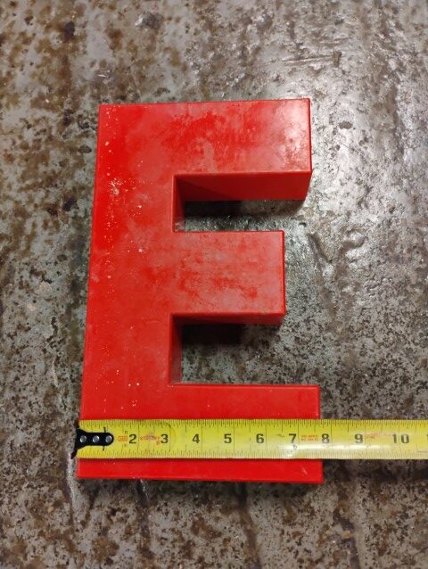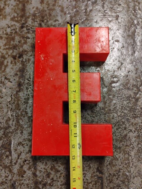 “E” Sign, Red, Plastic, Approximately 16in. in Diameter. Please inspect the photos carefully for condition, all items are sold as is.