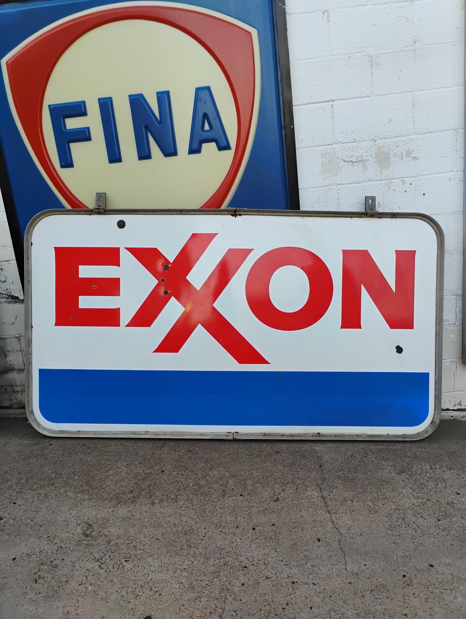 Exxon Sign, Double Sided, Approximately 46 1/2in. x 84in. Please inspect all photos carefully for condition, all items are sold as is.