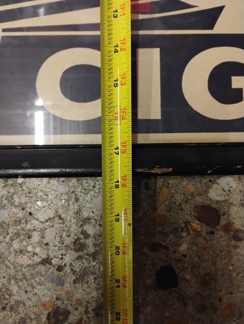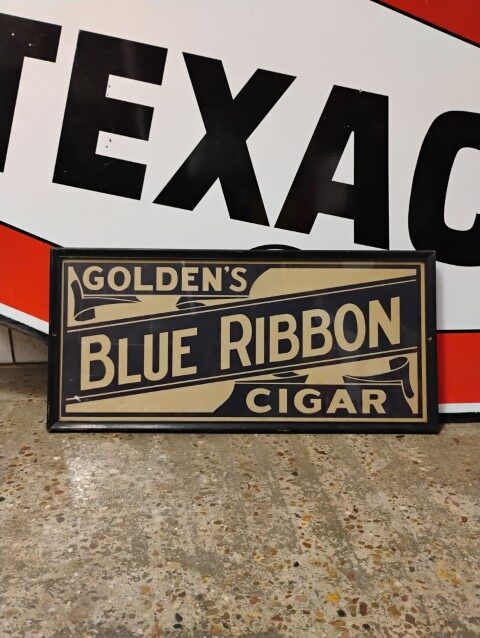 Framed Golden’s Cigar Ad, White and Blue, Approximately 18in. x 37 1/2in. Please inspect all photos carefully for condition, all items are sold as is.