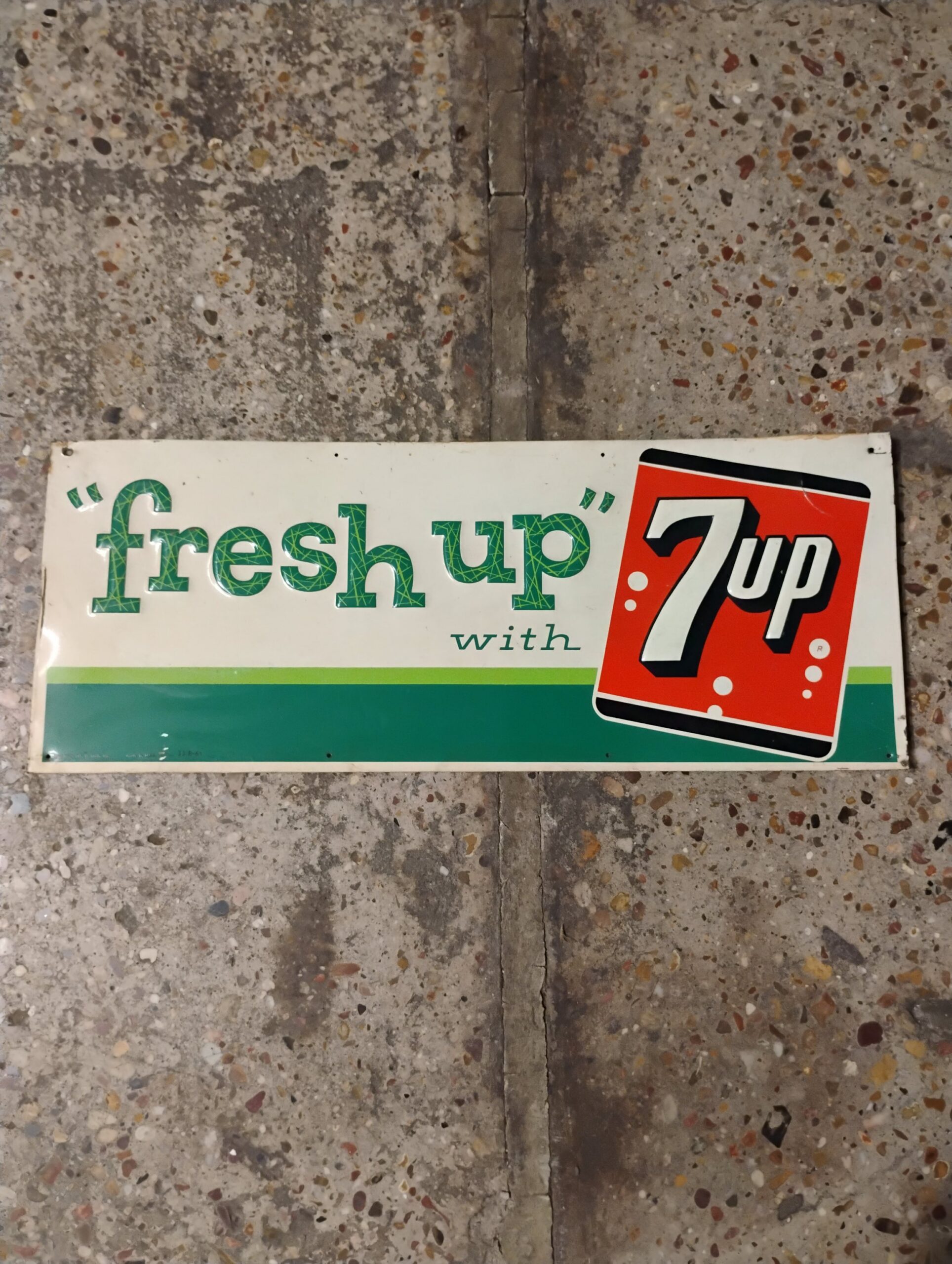 Fresh Up 7-Up Sign, Circa 1961, Approximately 1ft. X 2ft. 6in., Green and White. Please inspect all photos carefully for condition, all items are sold as is.
