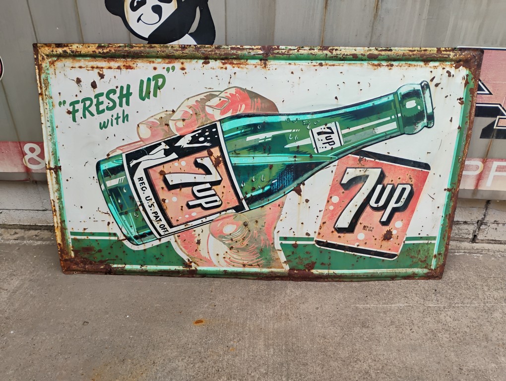 Fresh Up with 7-Up Sign, Green and White, Approximately 33in. x 57in. Please inspect all photos carefully for condition, all items are sold as is.