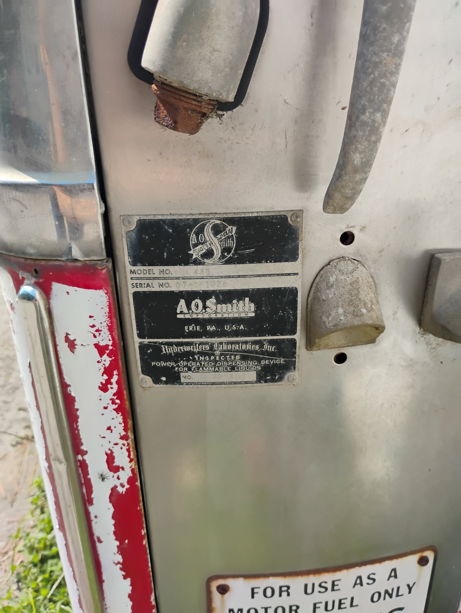 Gas Pump, A.O. Smith, White and Red, SN: 07-CF1228, Model: 483. Please inspect all photos carefully for condition, all items are sold as is.