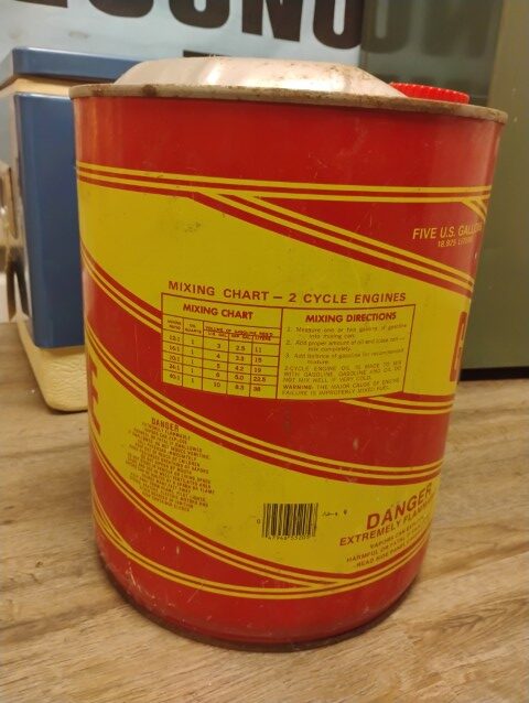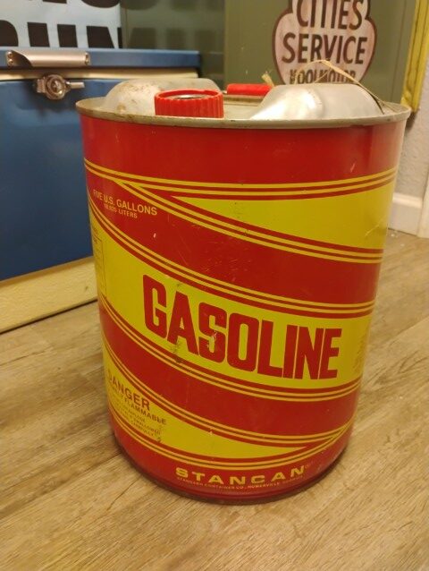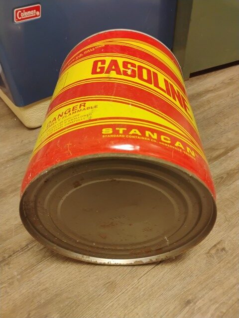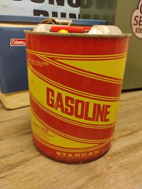 Gasoline Gas Can, Empty, 5 Gallons, Red and Yellow.