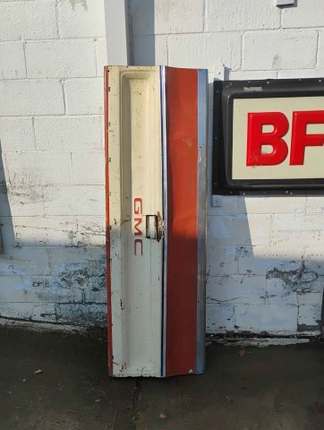 GMC Tailgate, Red and White, Approximately 67in. x 23in. Please inspect all photos carefully for condition, all items are sold as is.