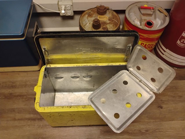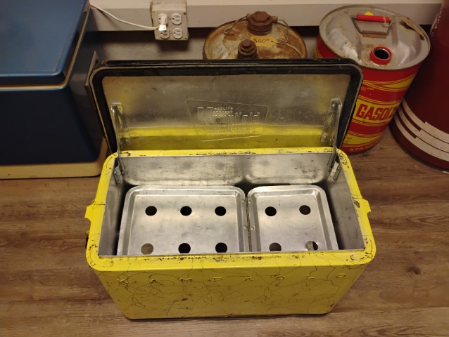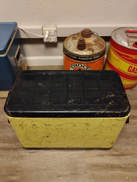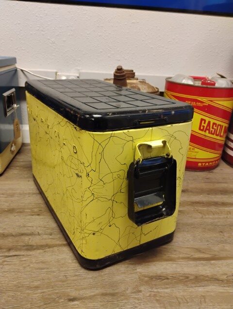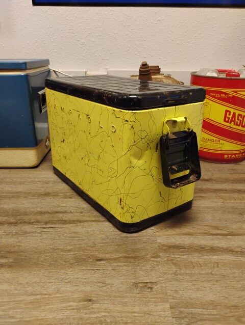 Kamp Kold Cooler, Features a Removable Interior Tray, Yellow and Black. Please inspect all photos carefully for condition, all items are sold as is.