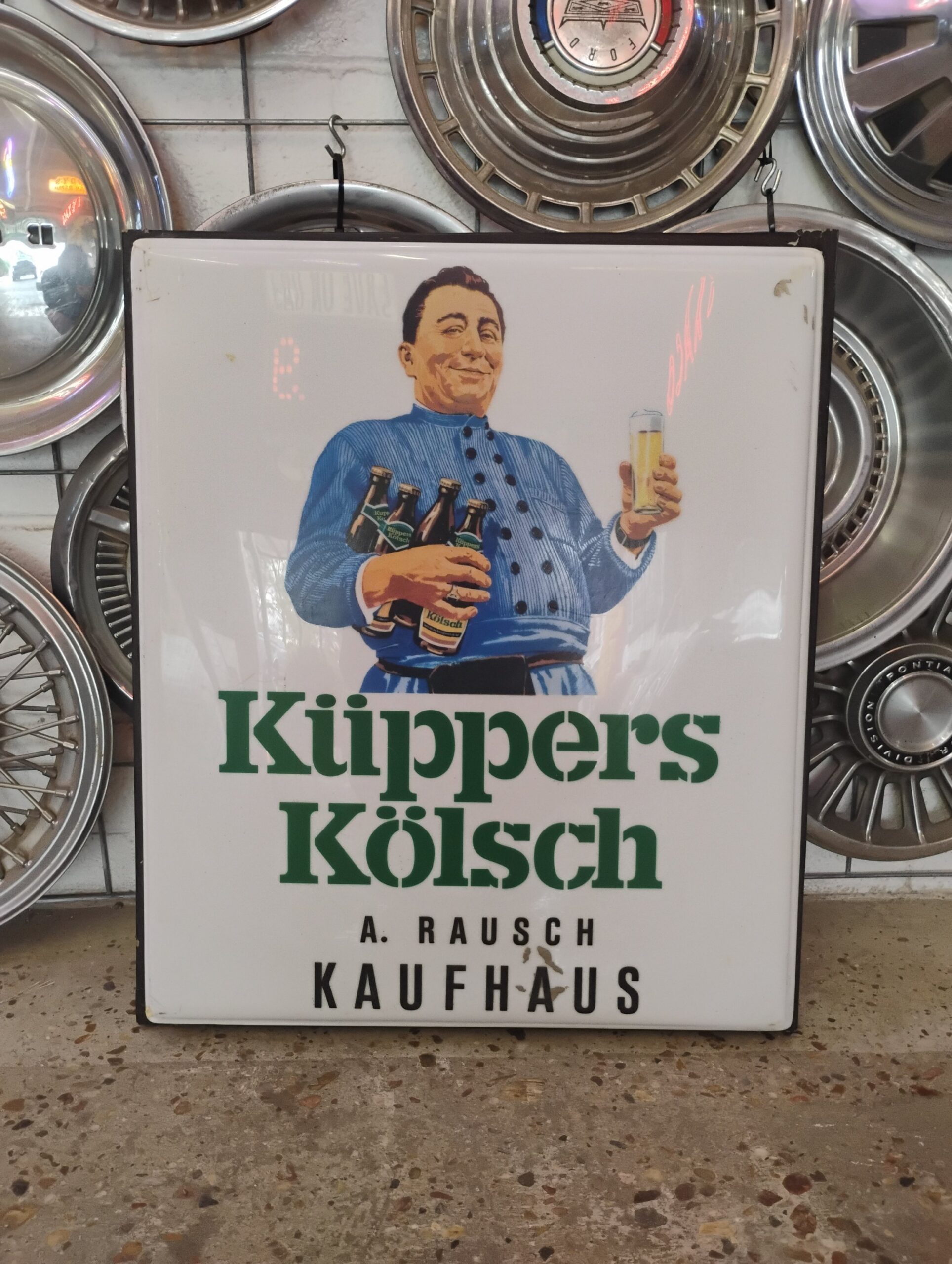 Kuppers Kolsch, Glass, Wooden Frame, Approximately 23 1/2in. x 27 1/2in. Please inspect all photos carefully for condition, all items are sold as is.