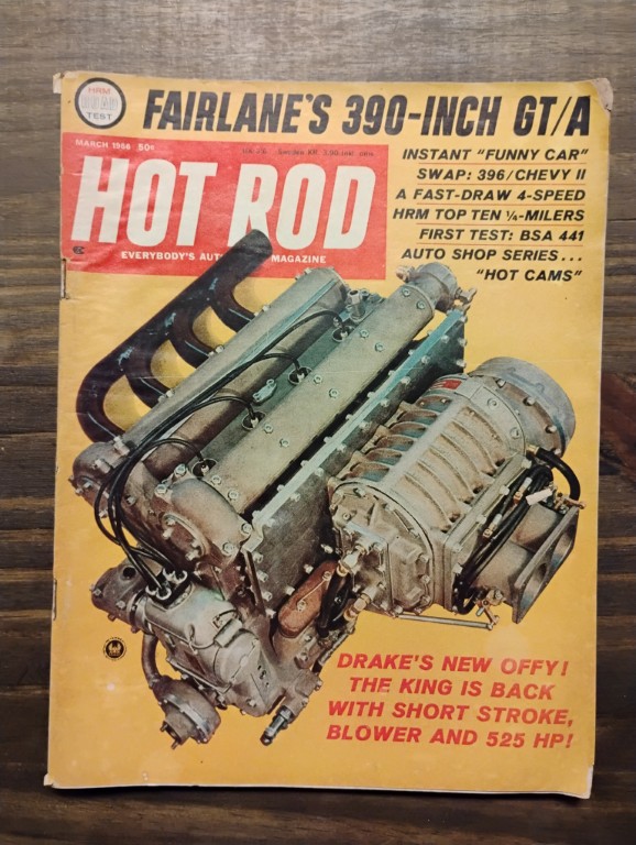 March 1966 Hot Rod Magazine, Features Fairlane’s 390-Inch GT/A, Advertising a Ford ad on the back.
