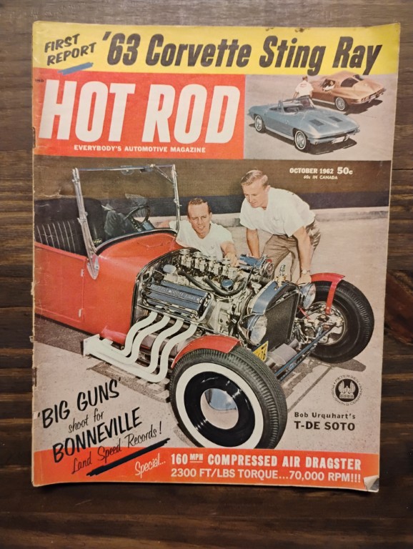 October 1962 Hot Rod Magazine, Features ’63 Corvette Sting Ray, Advertising Winston Cigarettes ad on the back. Please inspect all photos carefully for condition, all items are sold as is.