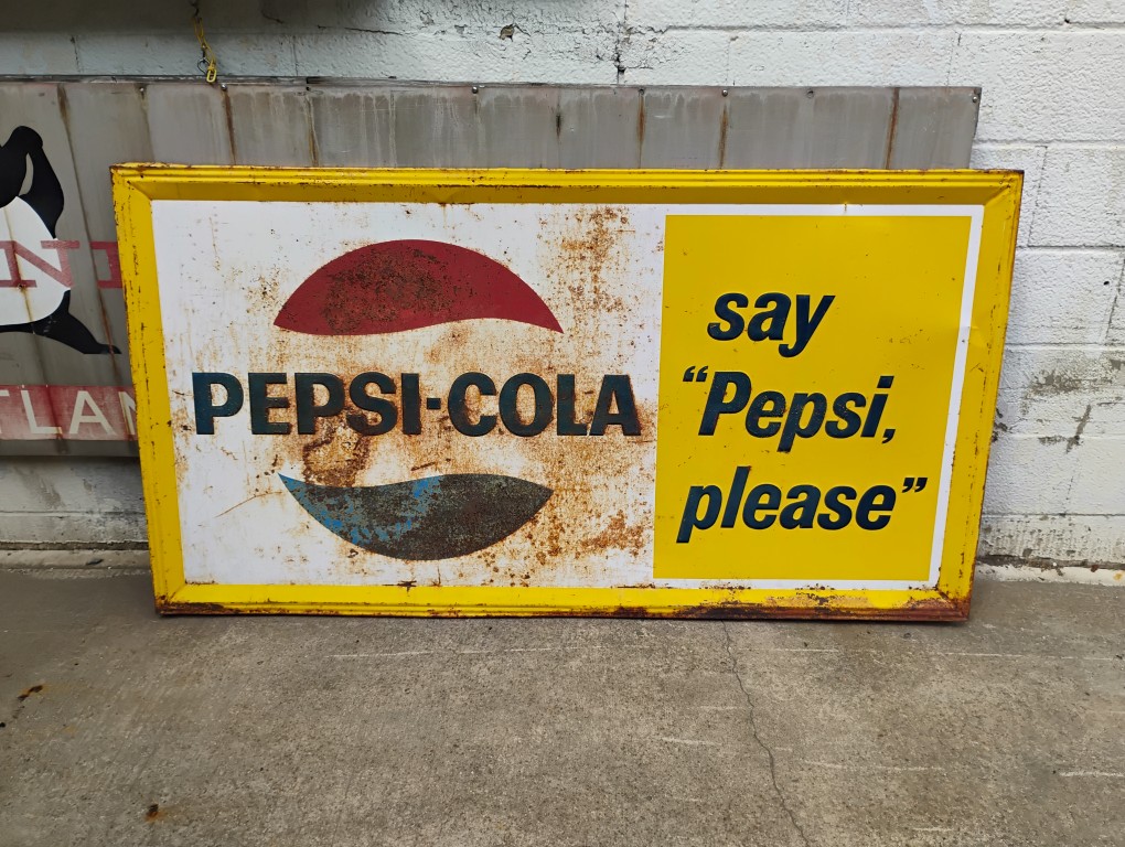 Pepsi-Cola Sign, Yellow and White, Embossed, Approximately 67in. x 36in.