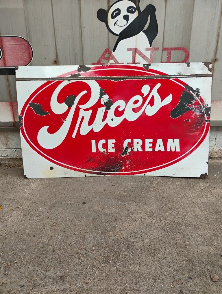 Price’s Ice Cream Sign, White and Red, Single-Sided, Approximately 45in. x 27in. Please inspect all photos carefully for condition, all items are sold as is.