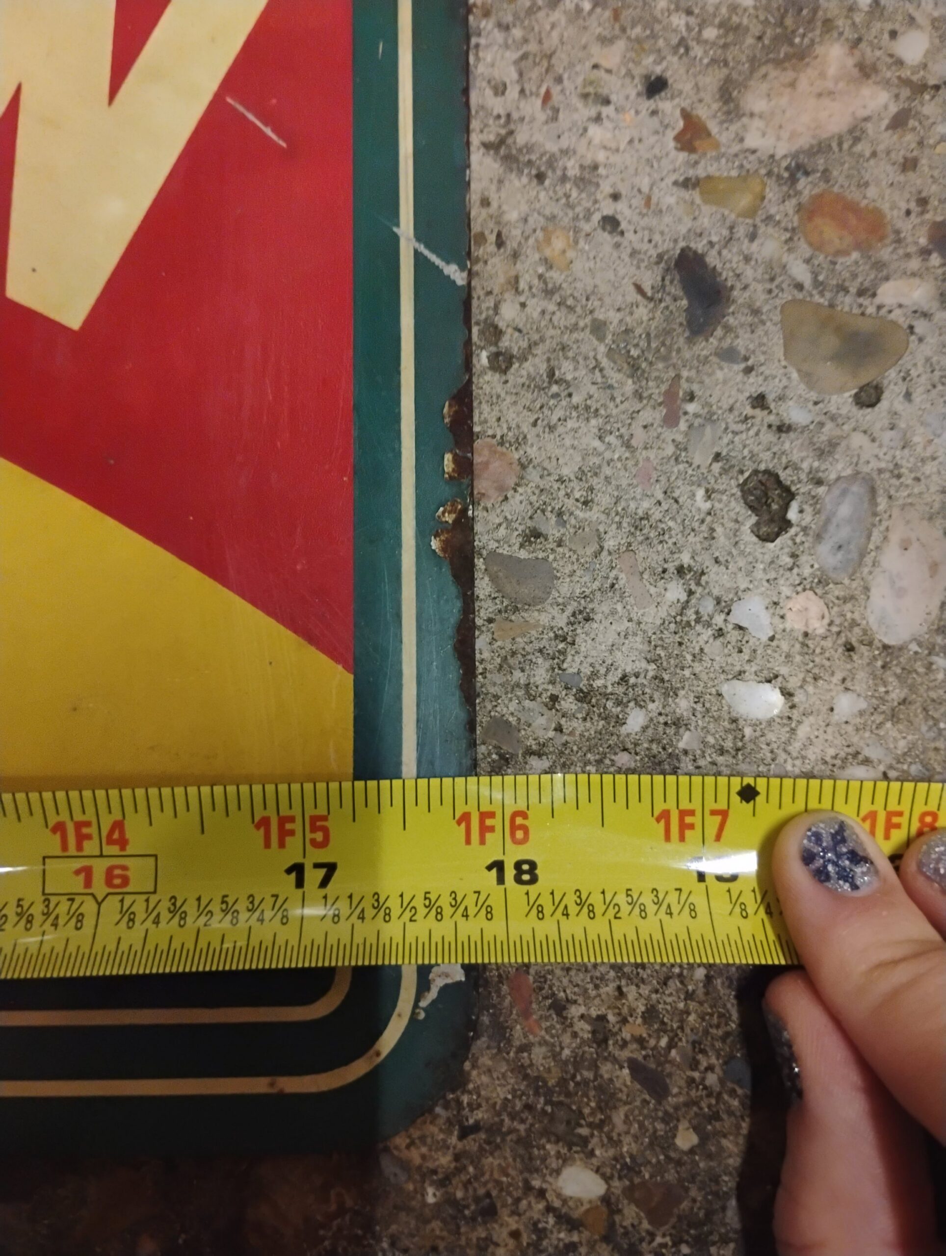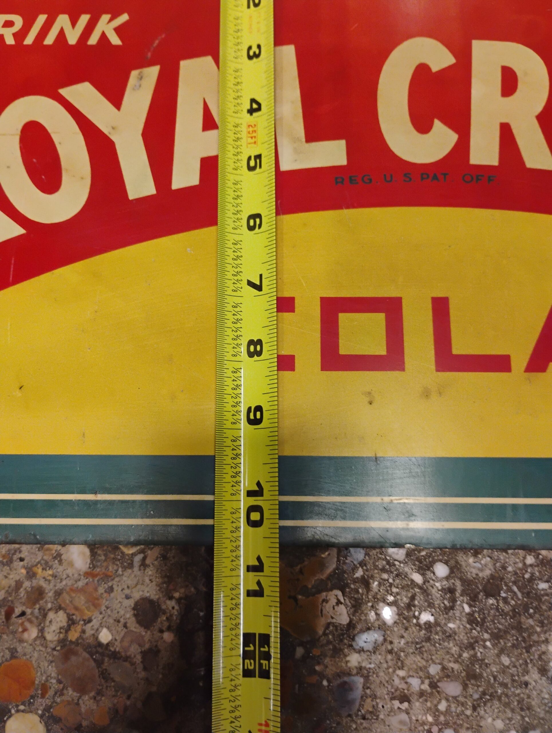 Royal Crown Flange Sign, Approximately 1o 1/2in. X 18in., Red, Green, and Yellow. Please inspect all photos carefully for condition, all items are sold as is.