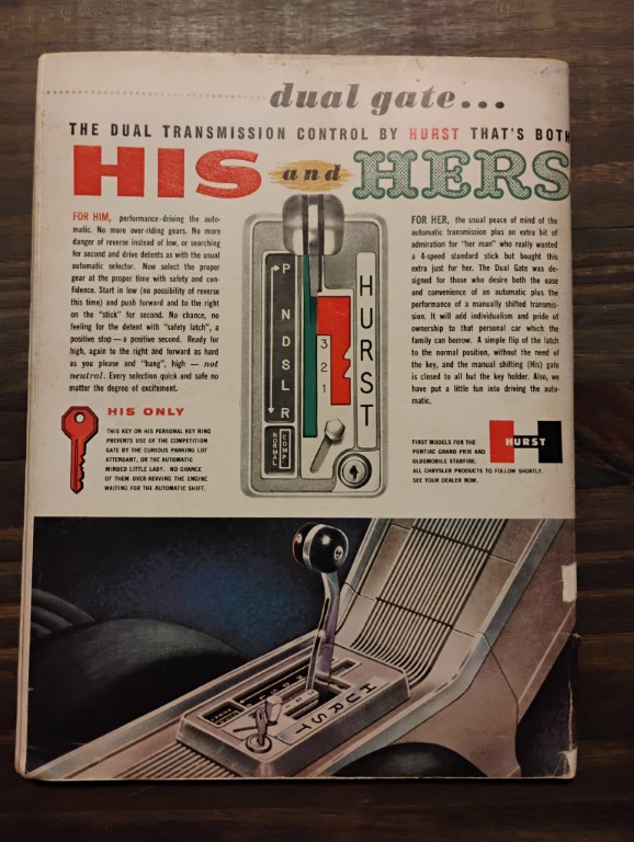 September 1963 Hot Rod Magazine, Features New 4-Speed for 426 Chrysler, Advertising Hurst Dual Transmission Control ad on the back.