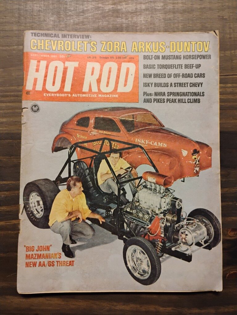 September 1967 Hot Rod Magazine, Features Big John Mazmanian’s New AA/GS Threat, Advertising Ray Charles Coca-Cola ad on the back.