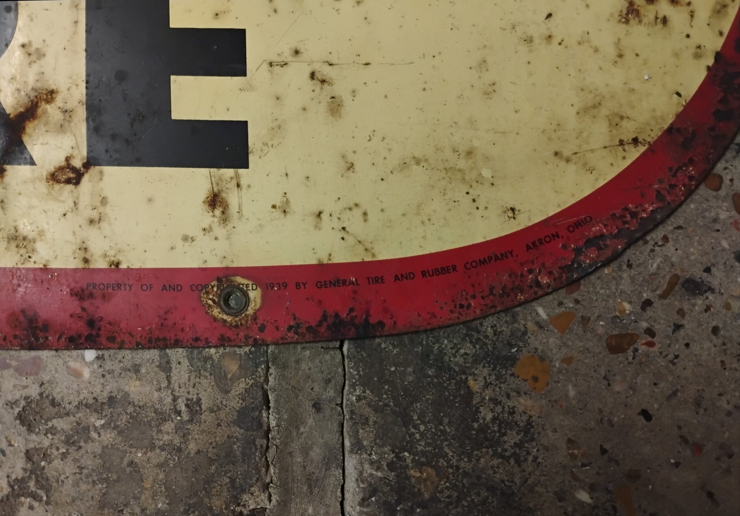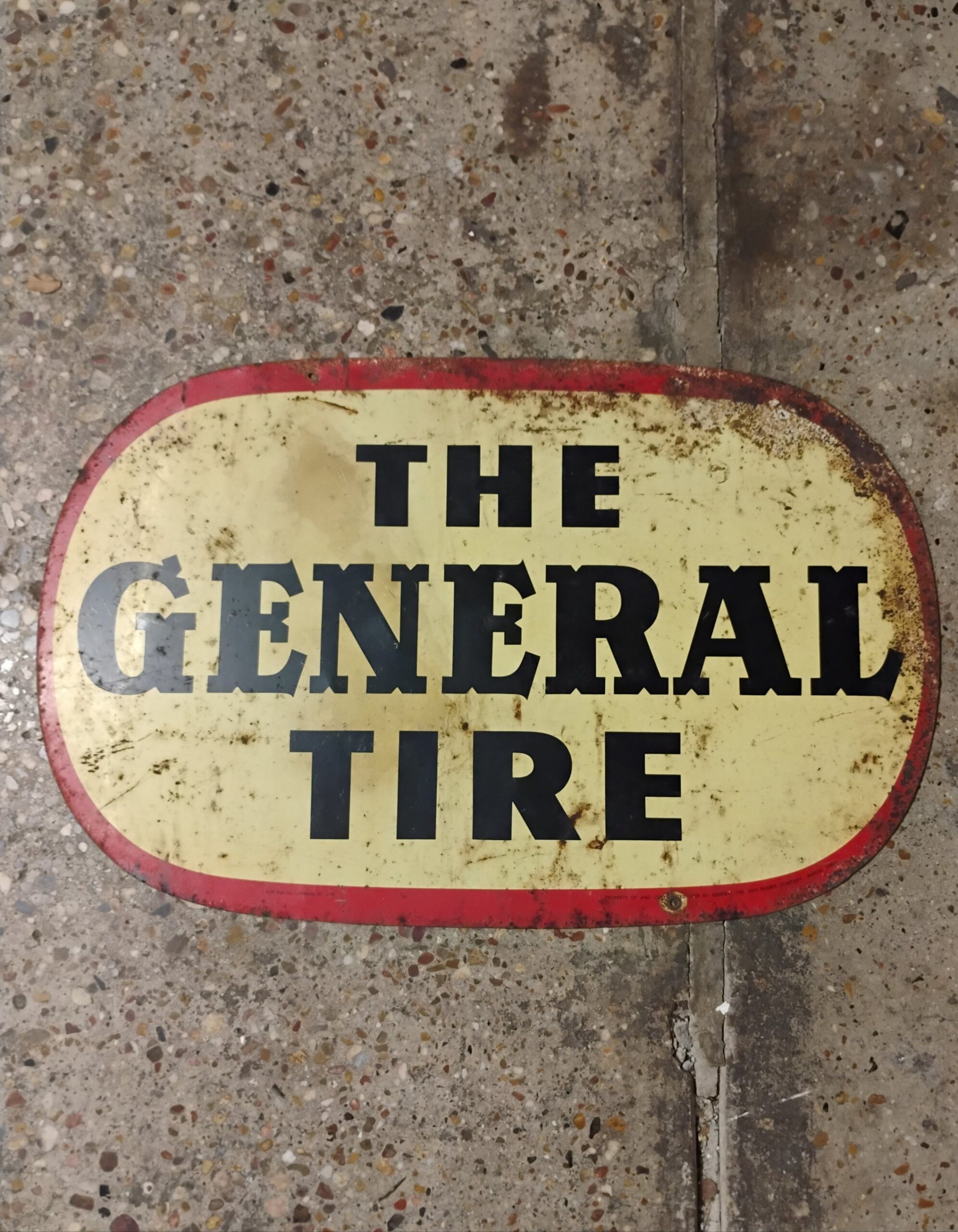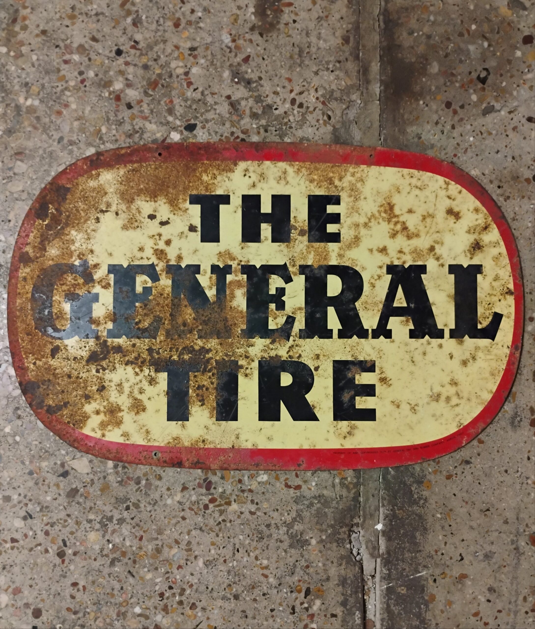 The General Tire Sign, Circa 1958, Double Sided, Approximately 1ft. 11in. x 3ft. Please inspect all photos carefully for condition, all items are sold as is.